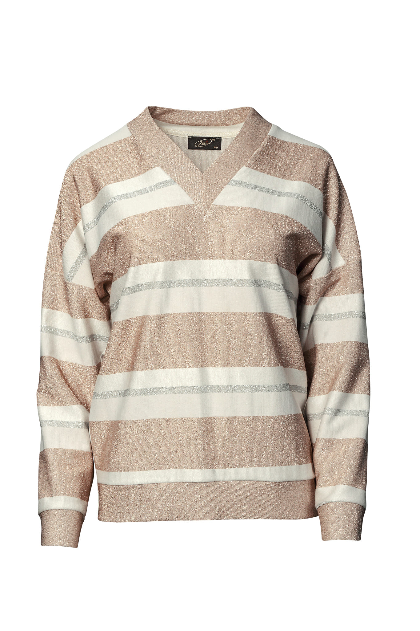 - Stylowa bluzka damska w eleganckim połączeniu miedziano-ecru, ozdobiona subtelnym połyskiem metalicznej nitki