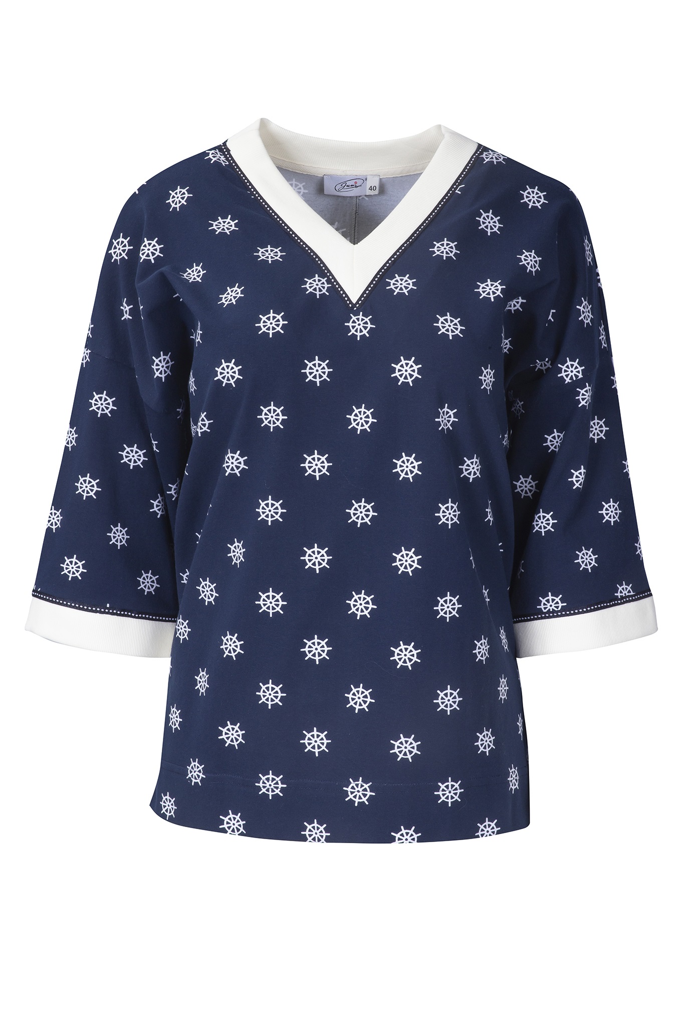 • Granatowa bluzka dresowa z białym wzorem kół sterowych i białym wykończeniem dekoltu.