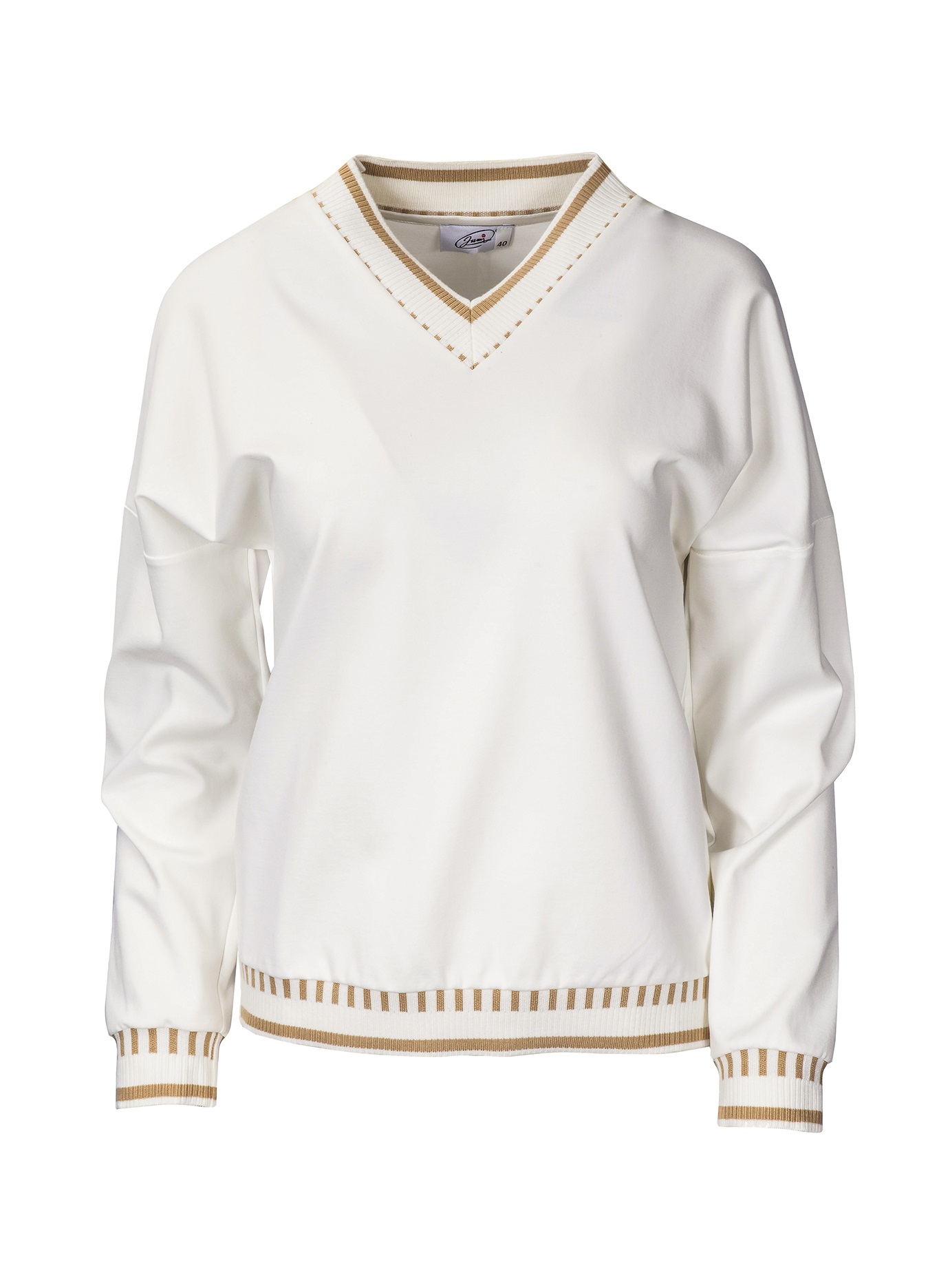 Szukasz ubrania, które łączy w sobie swobodę z nienagannym wyglądem? Nasza elegancka bluza dresowa z dekoltem V to propozycja zaprojektowana specjalnie dla dojrzałych kobiet, które nie chcą wybierać między stylem a komfortem. Biały kolor bazowy dodaje twarzy blasku oraz optycznie odejmuje lat. Ponadto dekolt w kształcie litery V to sprawdzony sposób na wysmuklenie sylwetki i podkreślenie linii szyi. Warto zauważyć, że ozdobne ściągacze przy rękawach, dekolcie oraz na dole bluzy zostały wykończone subtelnym, beżowo-złotym motywem pasków. Dzięki temu bluza zyskuje unikalny charakter, który przyciąga wzrok i nadaje całości luksusowego sznytu. Dlatego właśnie ten model cieszy się ogromnym uznaniem pań szukających uniwersalnych rozwiązań do swojej garderoby.
